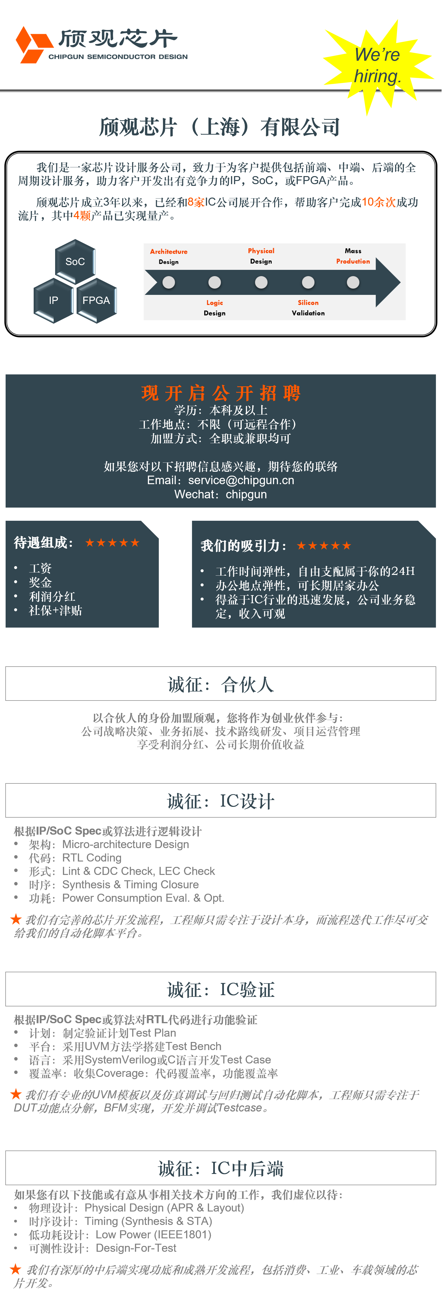 除了可测性设计,IP/SoC前端、中端、后端设计服务亦是颀观之核心业务,有芯片设计领域合作需求的伙伴们可随时联系我们。
